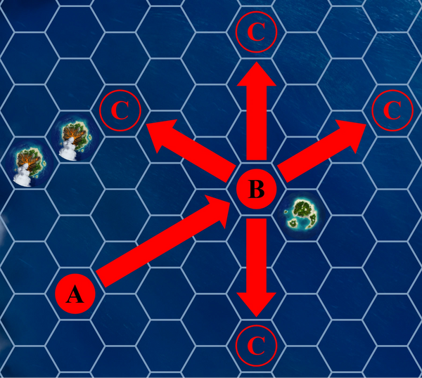 Red ships are positioned at A and B. If a sail-3 die is spent on the ship at A, it may move to any of the spaces marked C. It may not move into hex B; allied ships cannot share a hex. It also cannot move through the volcano hex